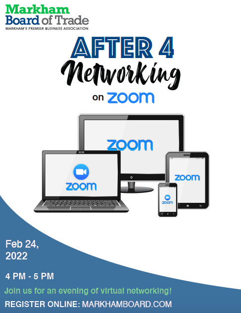 Join us for our Virtual After Hours Networking event on Thursday February 24th at 4 PM! Stay connected to your fellow MBT Members. Networking will include a chance to introduce yourself, share details about your business, and meet other members of the Markham Business Community!
