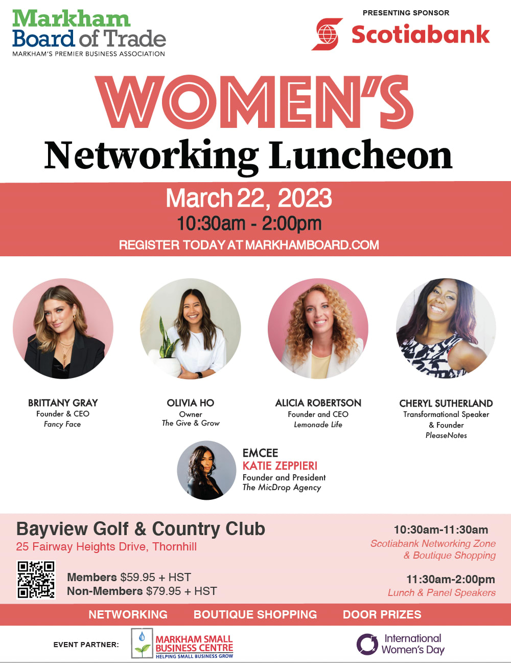 We are pleased to welcome you to our Women's Networking Luncheon on March 22 , 2023 from 10:30-2:00pm at Bayview Golf & Country Club.